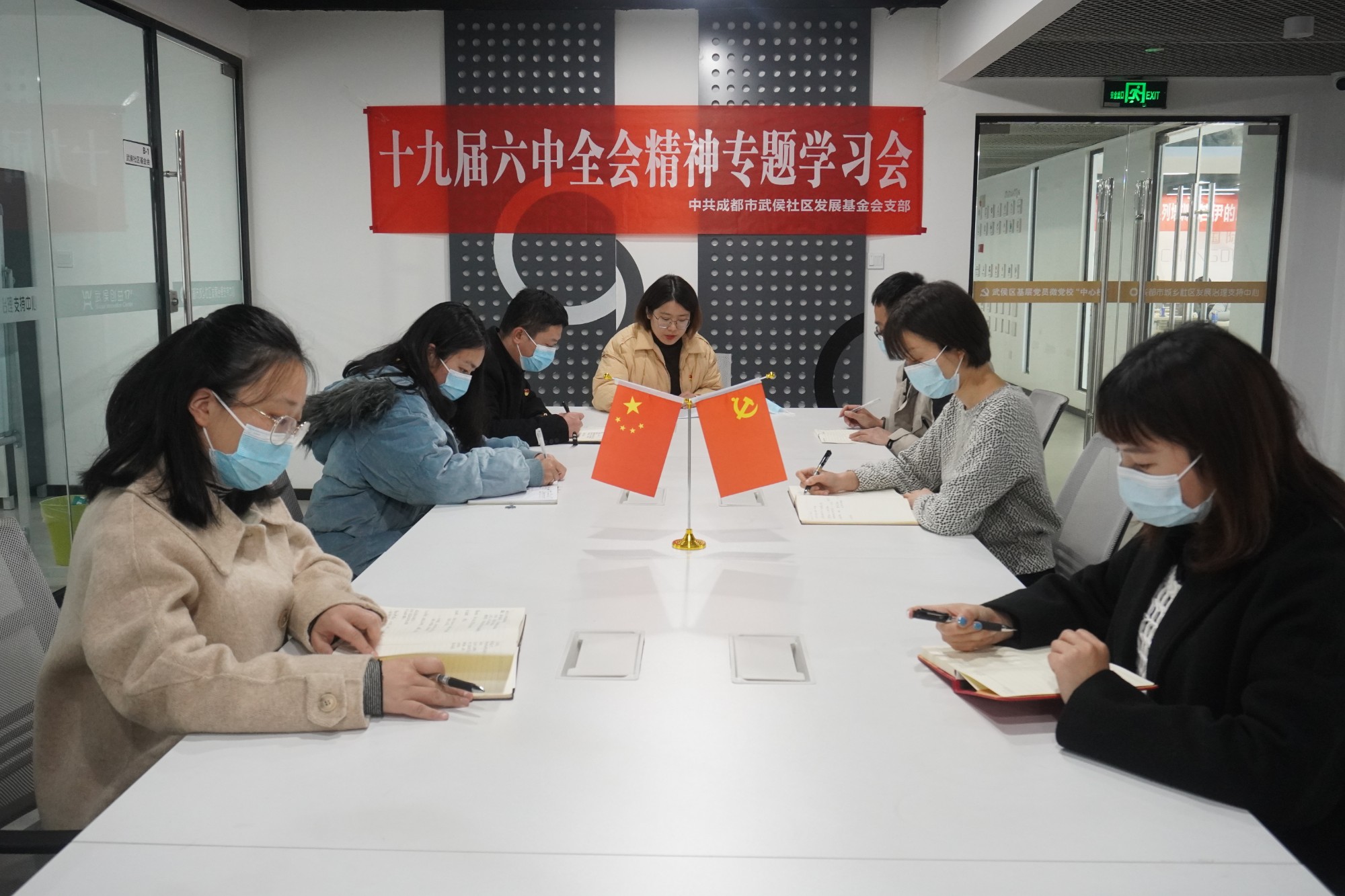 2021年11月26日,中共成都市武侯社区发展基金会支部开展党的十九届六中全会精神专题学习会。武侯社区基金会党支部全体党员参加了学习。基金会支部党员、入党积极分子参加会议,会议由支部书记张芳主持。会上,支部书记张芳传达学习《中国共产党第十九届中央委员会第六次全体会议公报》、 《中共中央关于党的百年奋斗重大成就和历史经验的决议》文件精神。