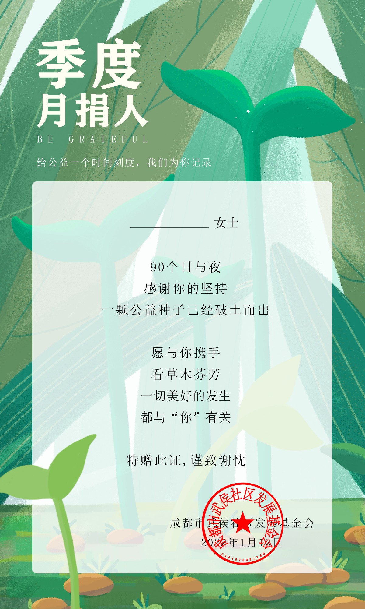 1月,基金会为月捐人共发送101份季度证书和年度证书表达感谢,定制化证书以“记录公益时间”为主题,实现个人荣誉展现,加强真实捐赠体验,激发更多人参与。